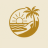 Gold line drawing of a sun setting over the ocean with a palm tree and a beach, enclosed in a circle on a light background.