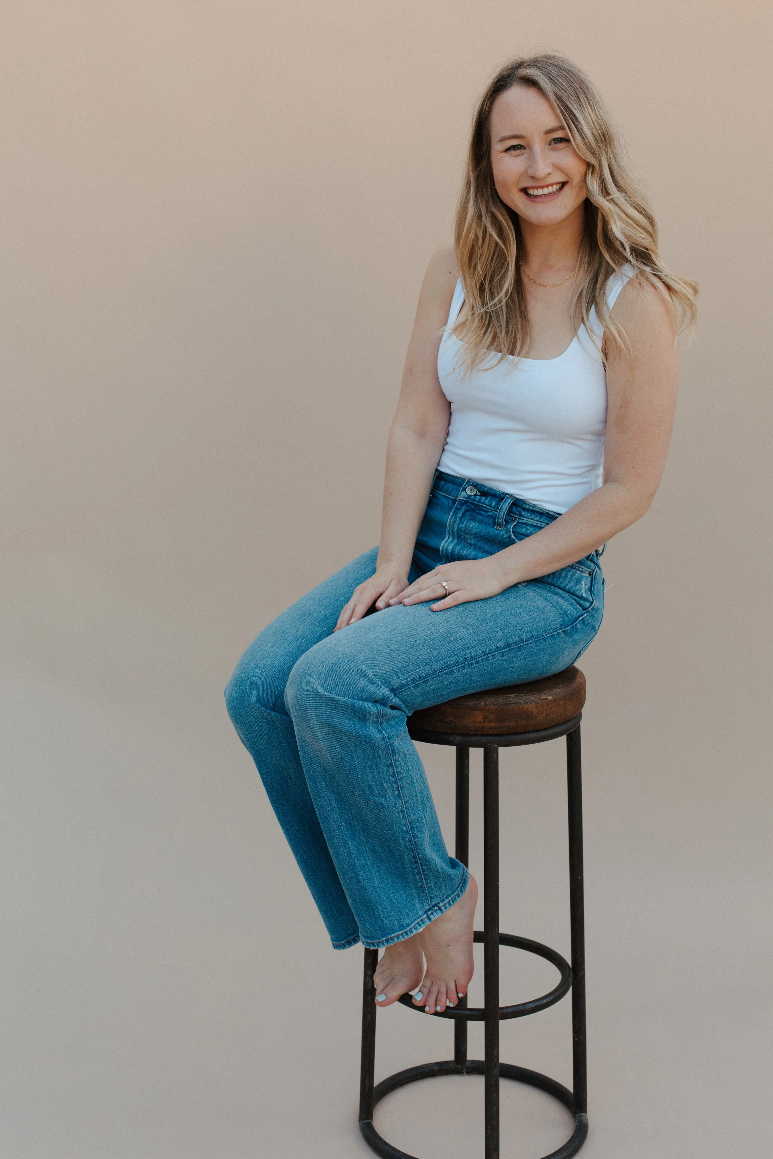 A woman with blonde hair sitting on a wooden stool against a beige background, smiling and wearing a white tank top and blue jeans.