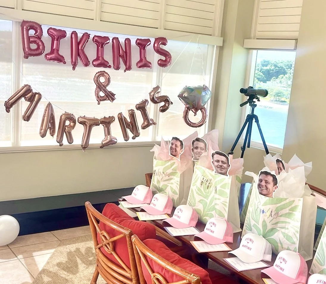 Decorations for a bachelorette party, including pink and rose gold balloons spelling out "BIKINI & BRIDES" and themed gift bags and hats with faces, placed on a table.